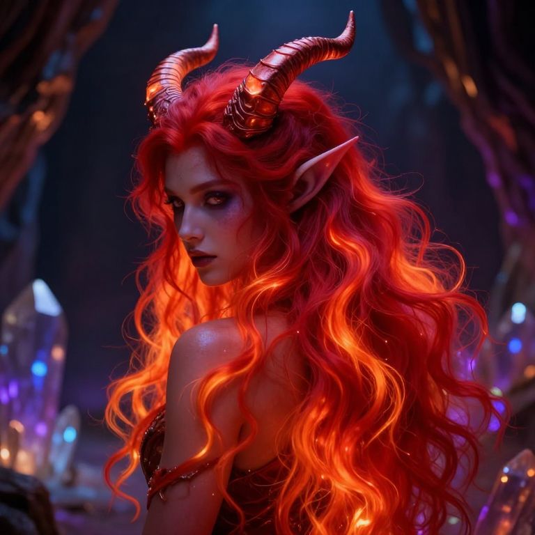 Tiefling hair portrayed as a living flame, thick locks swirling with colors of red, orange, and violet, soft glowing highlights illuminating detailed horns, magical aura emanating from the hair, set against a mysterious cavern background filled with glowing crystals.