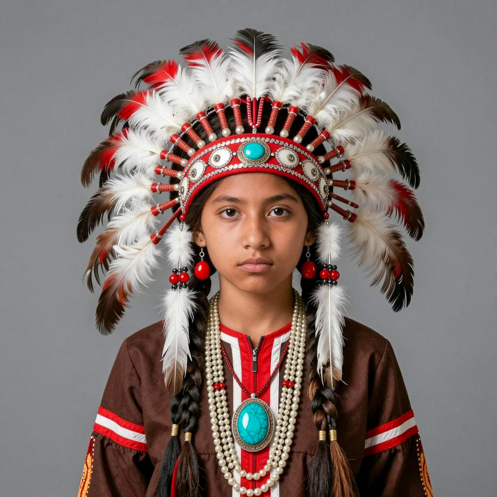 Atilogwu dance costume, photograph of Native American child, standing, wearing traditional headdress with large feathers, tan long-sleeve shirt, red skirt, multiple pearl necklaces, red and white beadwork, serious expression, braided hair, light brown skin, neutral background, full body, portrait, cultural attire, traditional clothing, detailed, realistic, high detail, traditional Native American fashion