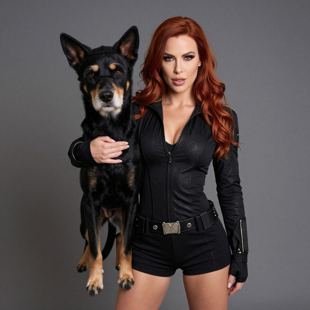 A photograph of a fair-skinned, red-haired woman with long, wavy hair wearing a black, zip-up, long-sleeve jumpsuit and black shorts, standing against a gray background. She is holding a black and tan German Shepherd dog in her left hand. The dog looks directly at the camera with alert, dark eyes and upright ears. The woman has a confident expression, with dark eyeliner and nude lipstick. The dog's fur is glossy, and the woman's outfit is sleek, highlighting her toned physique. The overall style is modern and edgy.