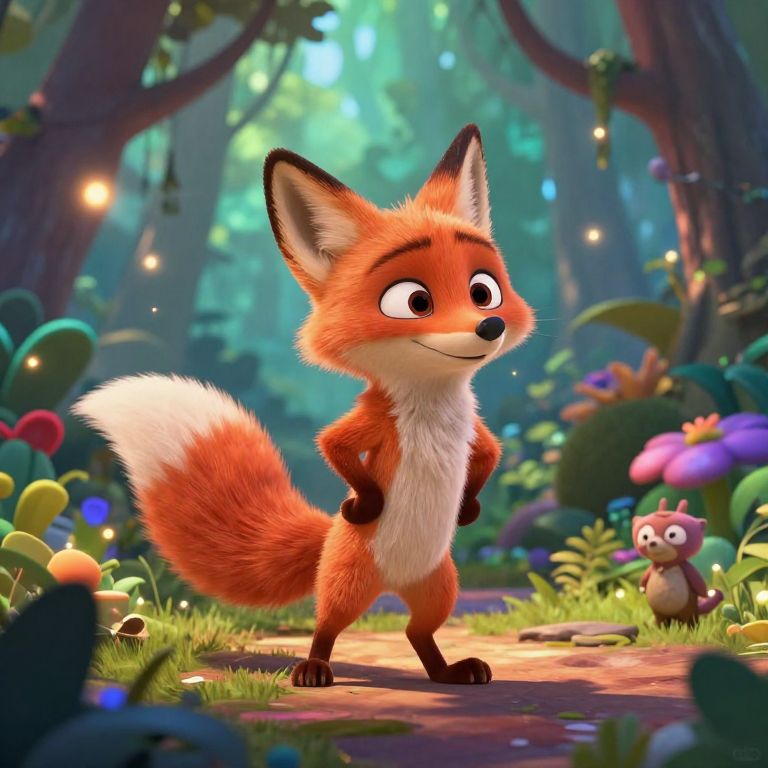 Disney Pixar style vibrant animation of a young adventurous fox exploring a magical forest, with lush colorful foliage, soft glowing lights, and whimsical creatures, emphasizing expressive eyes and dynamic poses, cinematic lighting, 3D animated look.