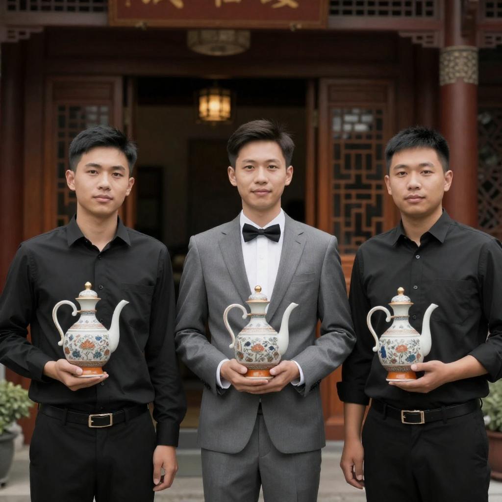 Photograph of three male waiters standing outside a traditional Asian restaurant. The left waiter wears a black shirt, the middle waiter in a gray suit with a black bow tie, and the right waiter in a black shirt. They hold ornate, ceramic water jugs with orange bases. The background features wooden doors and intricate, patterned columns.