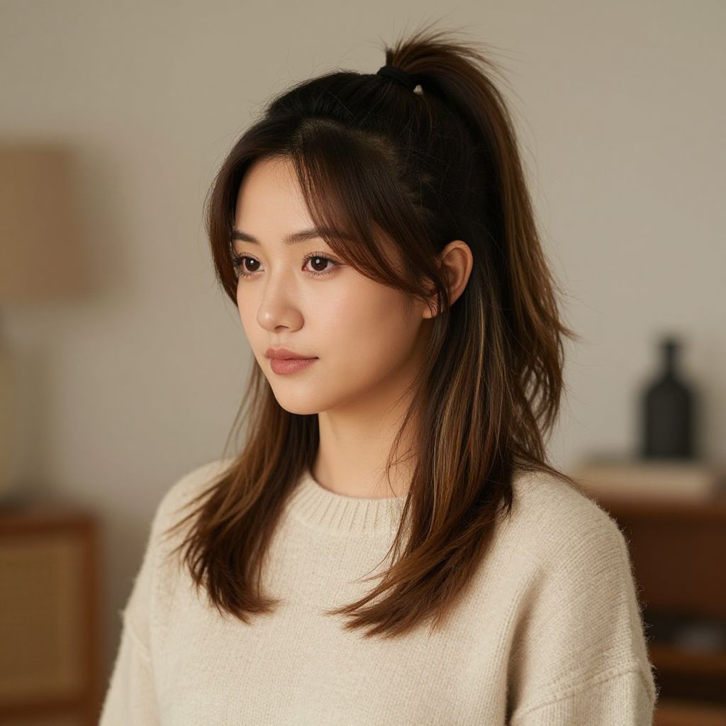 Woman with high ponytail with soft layers hairstyle, sophisticated and versatile style, casual brunch scene with café ambiance, light morning sun, linen clothing, calm expression, natural hair movement, lifestyle photography, soft colors, midjourney aesthetic