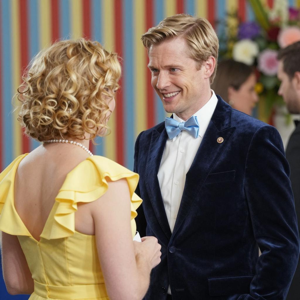 Man in gray suit with white shirt and black tie, blonde hair, seated on black leather couch, waving hand, looking at woman. Woman with blonde hair, white top, navy blue skirt, striped black and white leggings, standing with hands together in front. Background: venetian blinds, red building outside. Bright lighting, realistic style.