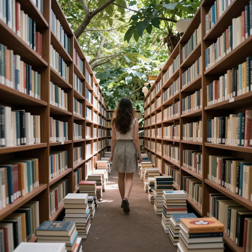 A woman walks through a surreal library aisle where towering bookshelves flank both sides, sunlight filters through lush green foliage above, and stacks of books rest on the earthy floor, blending the boundaries between literature and nature.