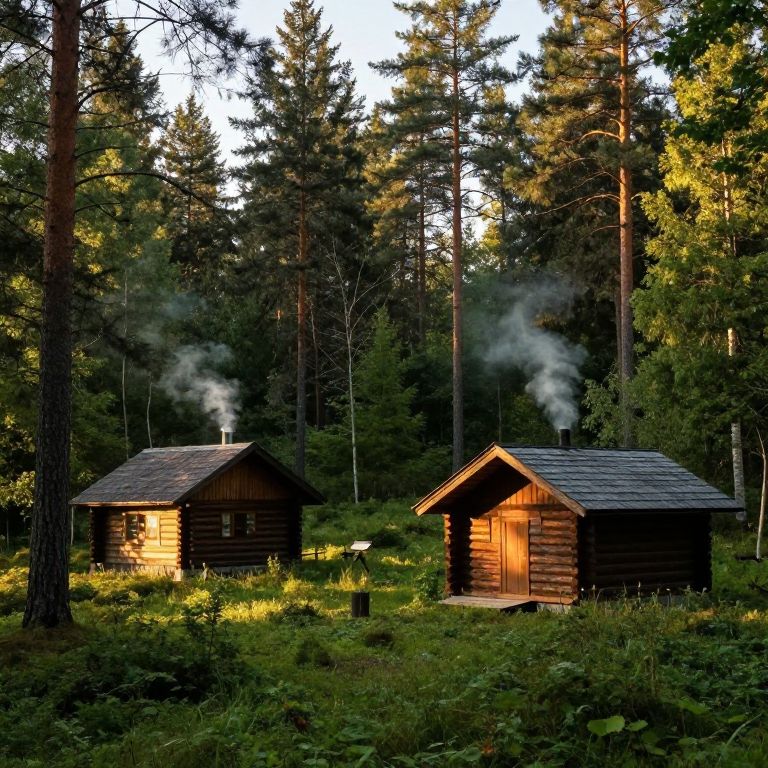 Photograph of two wooden cabins with smoke rising from chimneys, set in a sunlit, dense forest with tall pine trees.