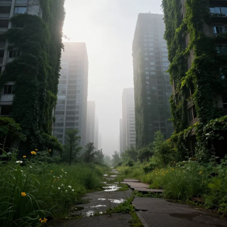 Photograph of a foggy urban alley between tall, overgrown apartment buildings with lush green vines, a muddy path, and wildflowers.