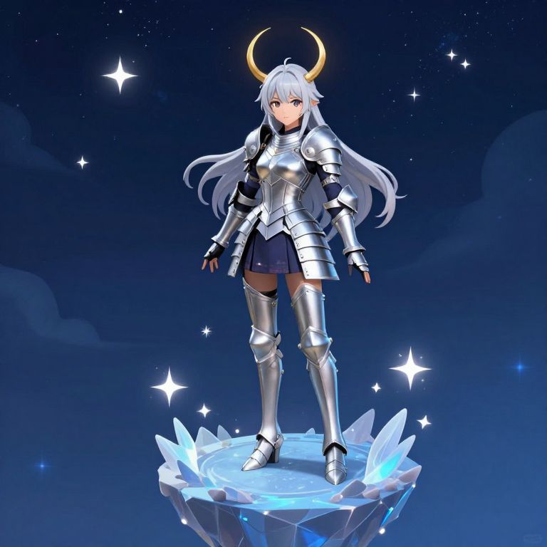 Isometric A beautiful girl in Japanese style, wearing silver armor, with slender legs, she is the patron saint of Aquarius, with Sky Island at her feet and starry sky of Aquarius behind her,
