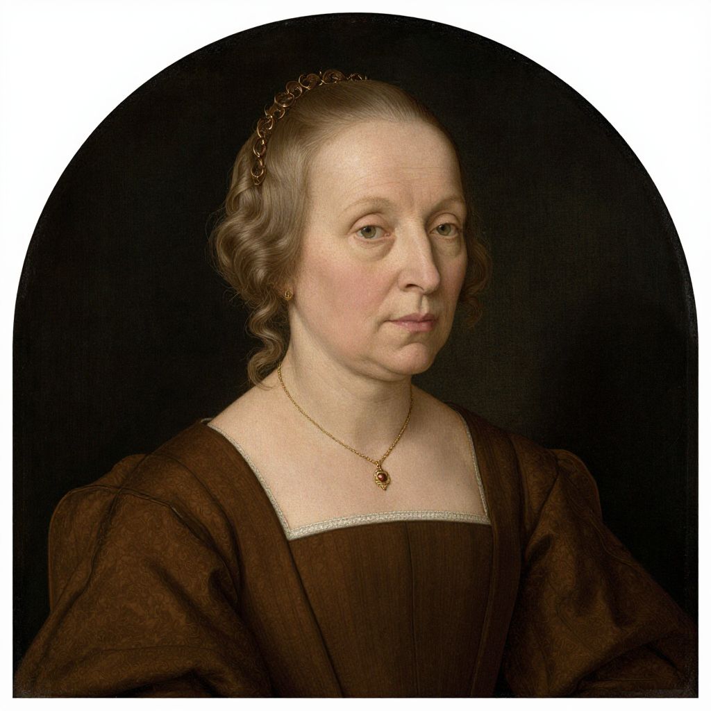 Renaissance-style portrait of a middle-aged white woman with brown hair, wearing a dark brown dress, gold necklace, and headband, against a
