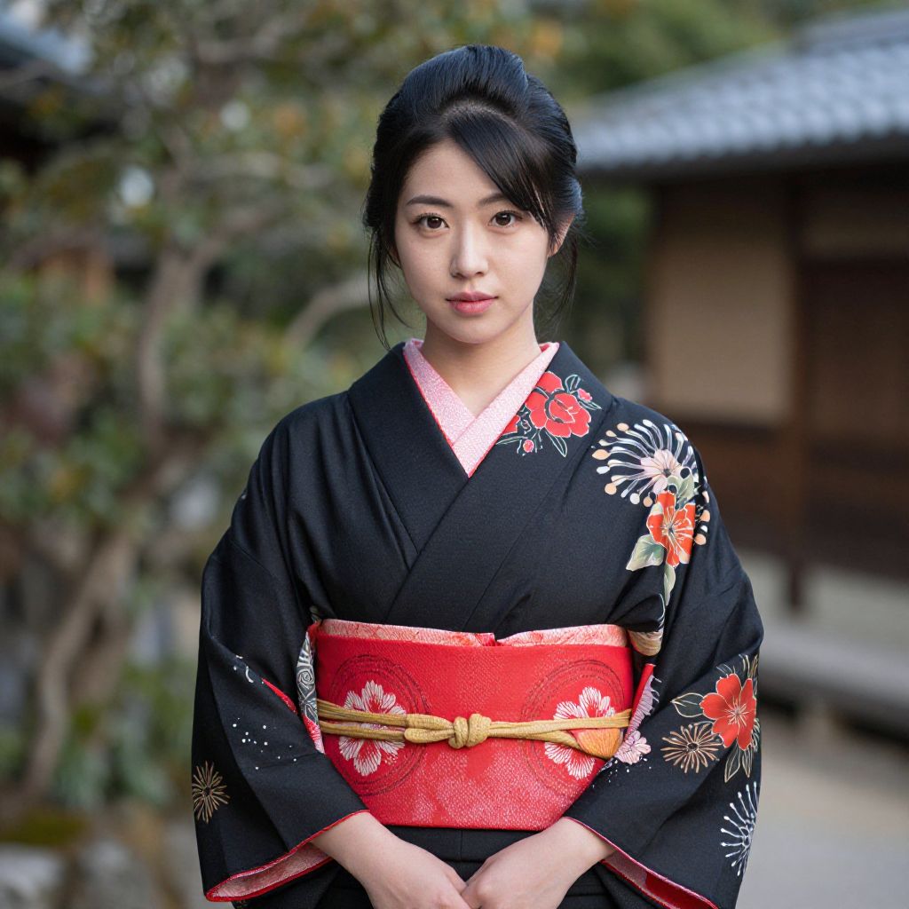 Woman Chun in Black and Red Kimono