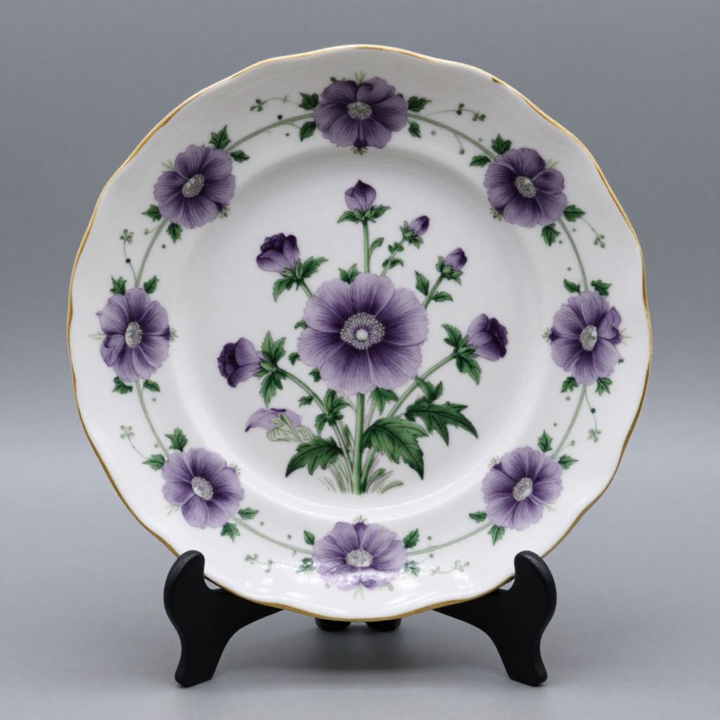 Photograph of a round, white porcelain plate with a scalloped edge, held on a black plastic stand. The plate features a floral design with large, vivid purple flowers with dark centers, surrounded by green leaves and smaller buds. The flowers are evenly distributed across the plate, with a central cluster of larger flowers. A thin, gold rim accents the plate's edge. The background is a plain, gradient gray, highlighting the plate's detailed and colorful design. The plate's surface is smooth and reflective.