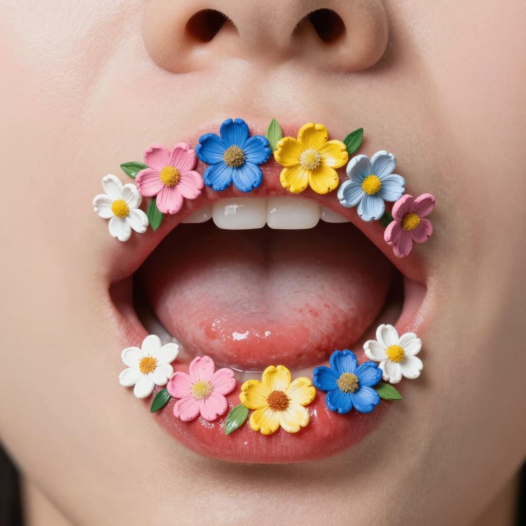 Close-up photograph of a person's lips. Lips are red and covered in small, colorful flowers made from paint. Flowers include pink, blue, yellow, and white petals with green leaves. Tongue is visible between slightly parted lips. Lips have a glossy ure.