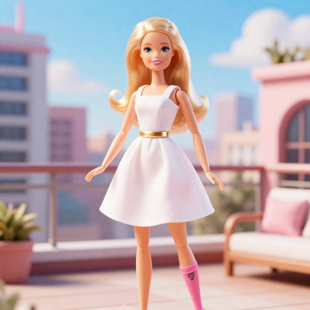 (masterpiece, best quality), highres, (8k, RAW photo, highest quality), ultra-realistic, 3d, centered, (TS_Barbie), mid shot, (full body:1.2), beautiful, a blonde barbie girl standing on a rooftop terrace in a white summer dress with gold belt in the style of pixar, (legwarms), pink heels, pink stockings, stockings, tattoo, (perfect lighting and composition:1), soft lighting, (high detail, 8K resolution:1), hdr:0.7, detailed face, perfect, (dynamic), pose, (high quality:1.2), plastic skin, ((shiny:1.3)), hourglass figure, smile, (depth of field:0.8), 50mm, film grain:0.7, fujifilmXT3, focus face, looking at viewer, (detailed eyes), floating particles, analog style, light makeup, lipstick, (thick waist, thick arms, thick thighs:0.6), luxury apartment, amazing composition, lively, ((volumetric lighting)), halation:0.5