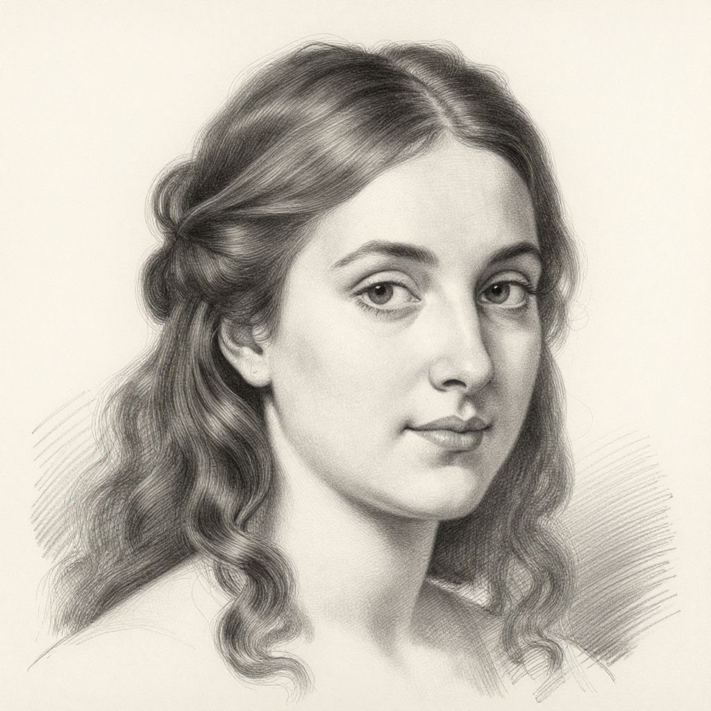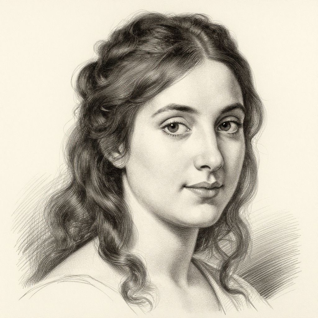 Black-and-white digital sketch of a young woman with wavy hair, fair skin, and subtle smile, facing slightly to the right.