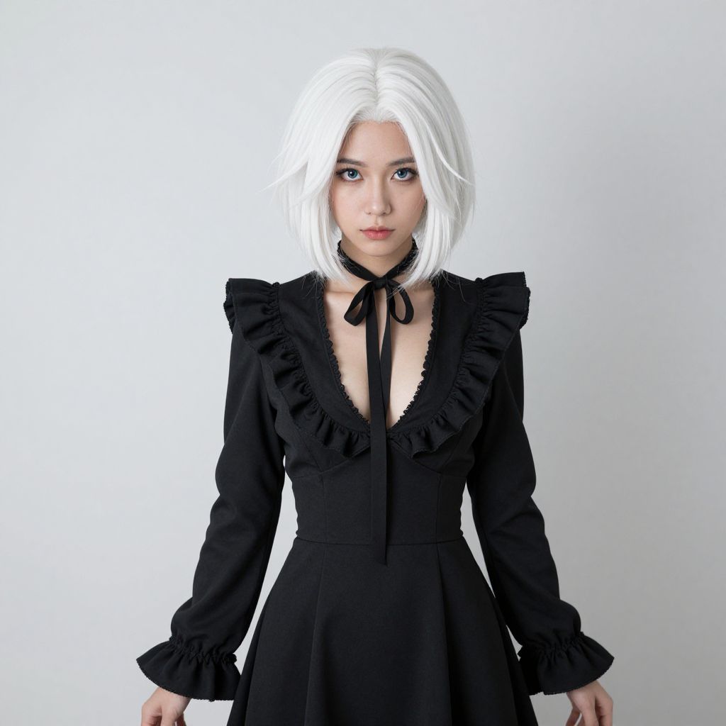Photograph of an Asian woman with long, white hair and fair skin, wearing a white sleeveless dress, standing against a gray background, arms crossed