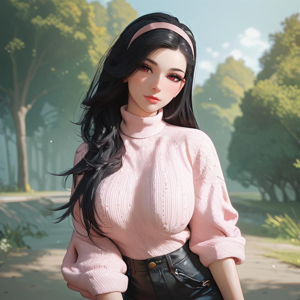Score_9, score_8_up, score_7_up, score_6_up, score_5_up, score_4_up, , source_cartoon, 3d, 1girl, solo, violetparr, long hair, black hair, hair over one eye, hairband, pink sweater, black pants, smile, looking at viewer, outdoors, trees