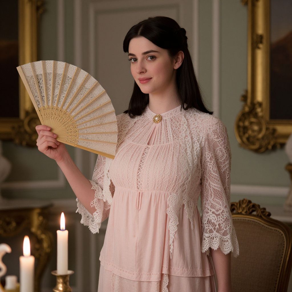 Photograph of a fair-skinned woman with straight, dark brown hair styled in an updo, wearing a light pink lace dress with three-quarter sleeves and a high neckline. She holds an ornate, cream-colored folding fan in her right hand. The background features a dimly lit, elegant room with green walls, gold-framed paintings, and two lit candles on a table to the left. The woman's expression is calm and composed, and the overall atmosphere is vintage and sophisticated.