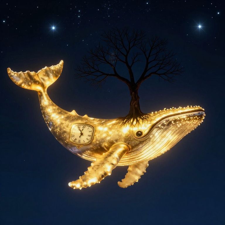 Glowing golden whale glides serenely through a star-studded night sky, its body adorned with a vintage clock face, while a bare tree emerges from its back, casting a surreal silhouette against the cosmic backdrop.