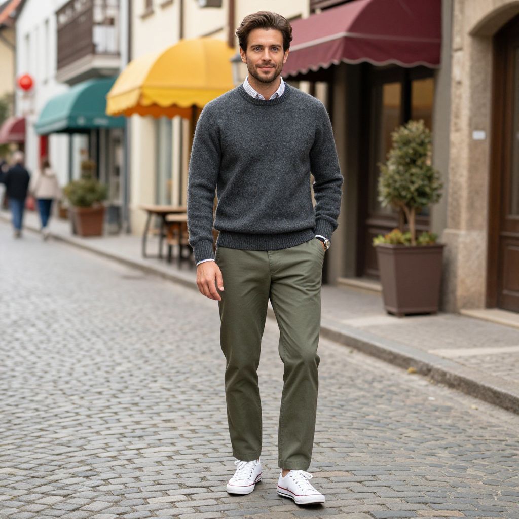 A man, charcoal cashmere sweater, olive green slim fit chinos, white canvas sneakers, charming cobblestone street, colorful awnings fluttering, vintage photo style, relaxed smile, enjoying the weekend.Man has masculine face and piercing eyes