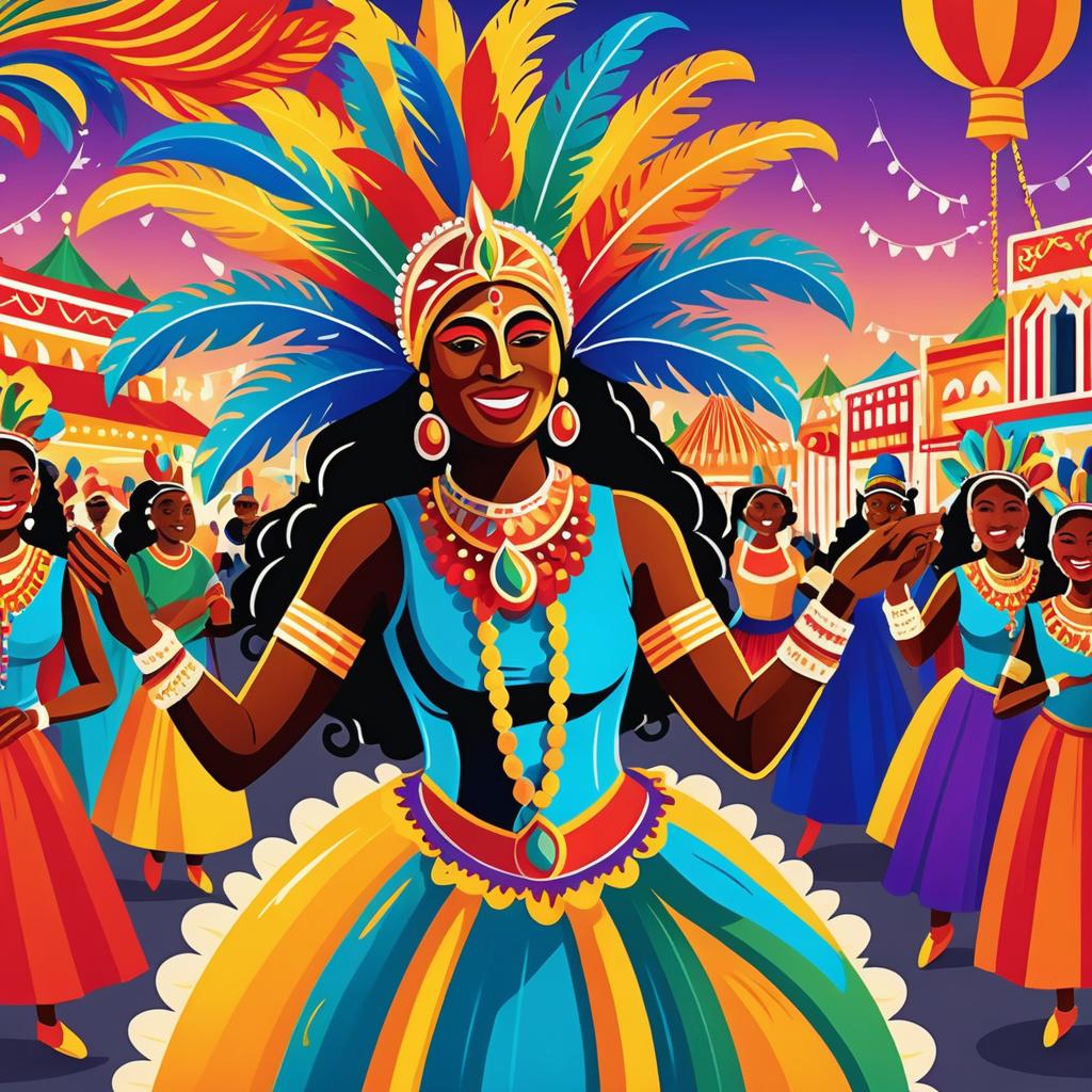 Illustration of a lively carnival parade featuring women in vibrant traditional costumes adorned with feathers and jewelry. The scene includes colorful decorations such as striped hot air balloons, flags, and festive tents under a bright blue sky. The central figure wears a detailed headdress and a multicolored dress, surrounded by similarly dressed dancers celebrating in the festival atmosphere.