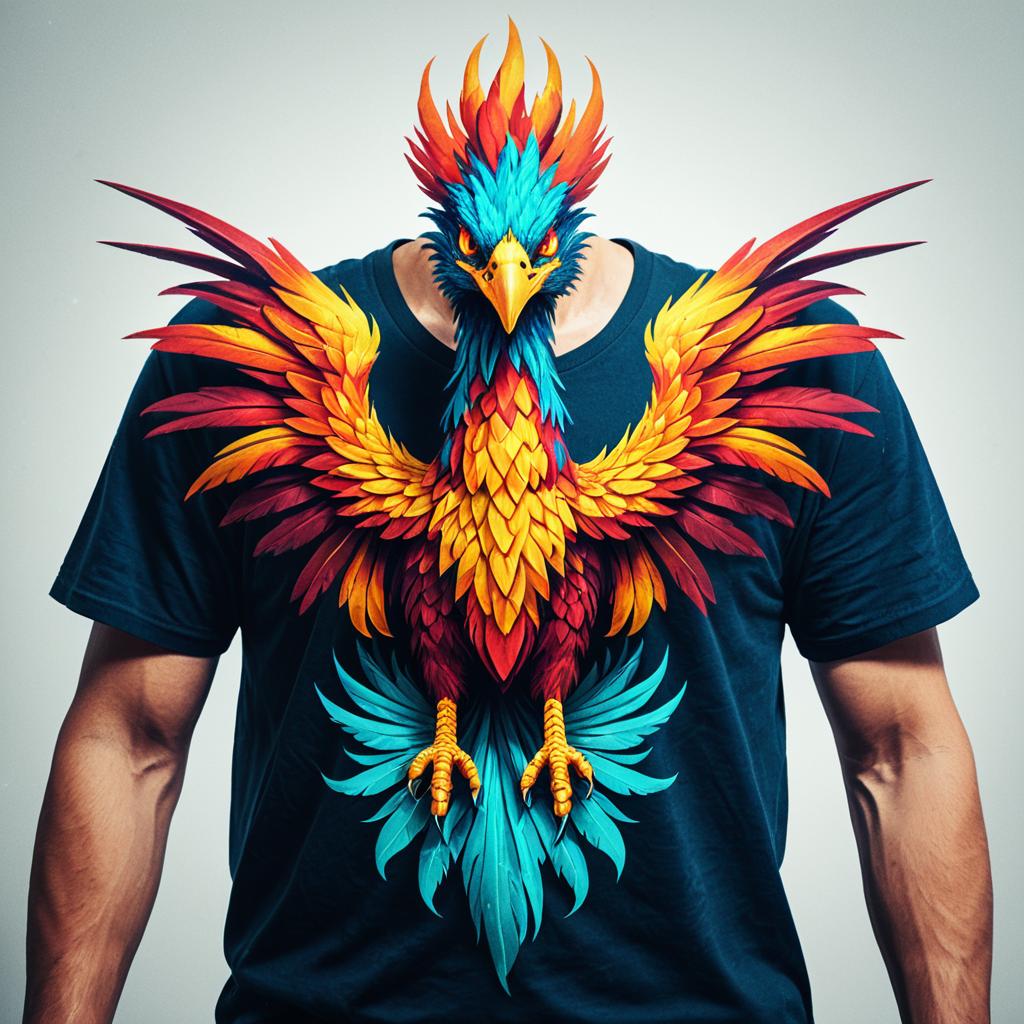 Upper body shot of a person wearing a dark t-shirt with a vibrant digital painting of a mystical phoenix. The phoenix design features bright colors including red, yellow, and blue, with animated and expressive character style. The artwork emphasizes thin, stylized features and intricate character design elements, creating a dynamic and eye-catching graphic on the t-shirt.