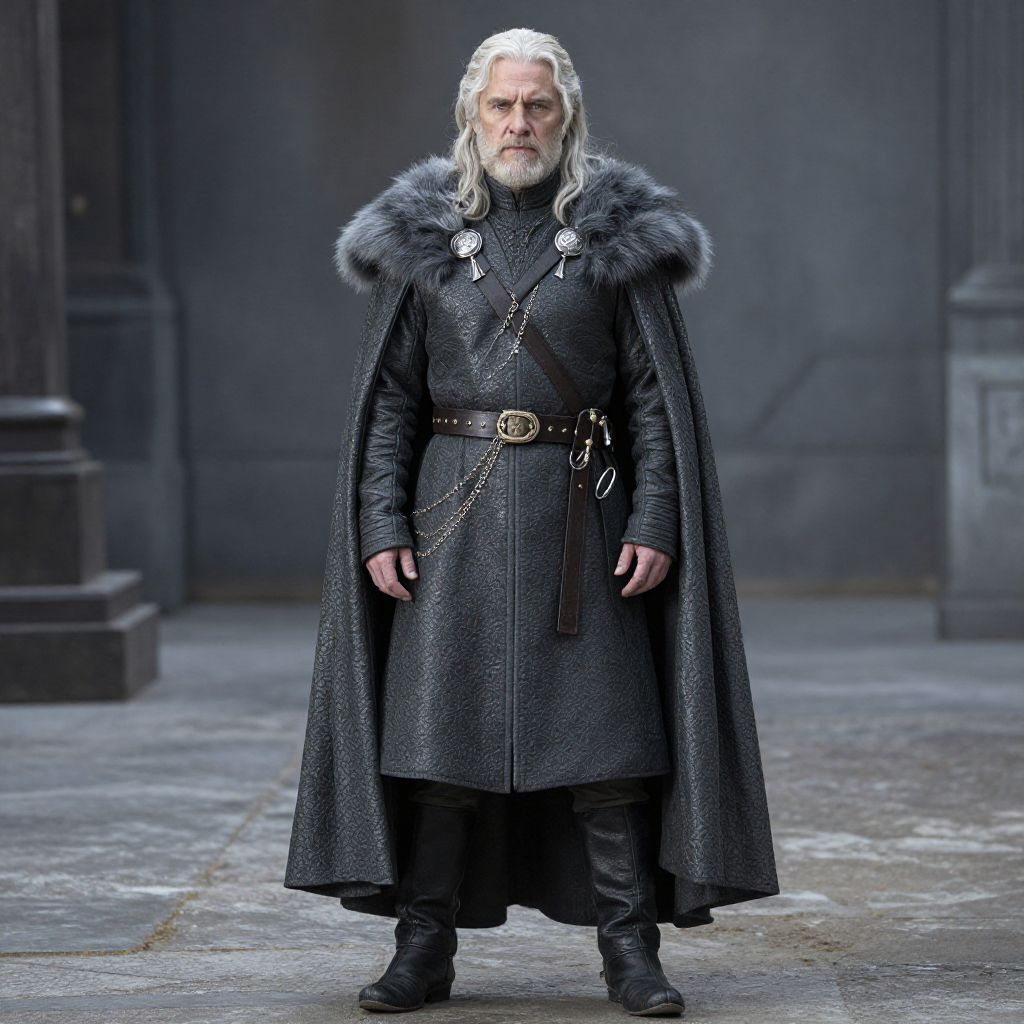 Game thrones costume male, 1boy, male focus, solo, old, old man, standing, cape, full body, facial hair, black footwear, boots, looking at viewer