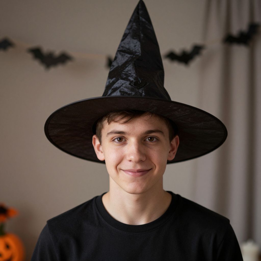 Premium man halloween, hat, solo, 1boy, male focus, witch hat, looking at viewer, upper body, smile, indoors