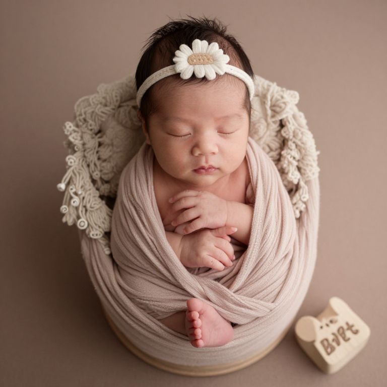 Photograph of a newborn baby, with closed eyes and a peaceful expression, swaddled in a beige, textured blanket. The baby wears a white floral headband and is nestled in a lace, cream-colored cradle. The baby's hands are gently clasped near the chest, and tiny feet are visible. To the right, a small wooden heart with "Baby" written on it rests on a soft, neutral background. The overall composition is warm and serene, emphasizing the innocence and delicacy of the newborn.