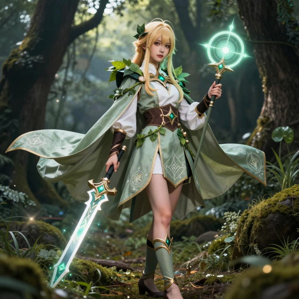 Cosplay generator crafting fantasy character costumes with flowing capes, mystical symbols, enchanted weapons, and nature-inspired details like leaves and vines, standing in a magical forest with ethereal lighting and floating particles enhancing the mood.