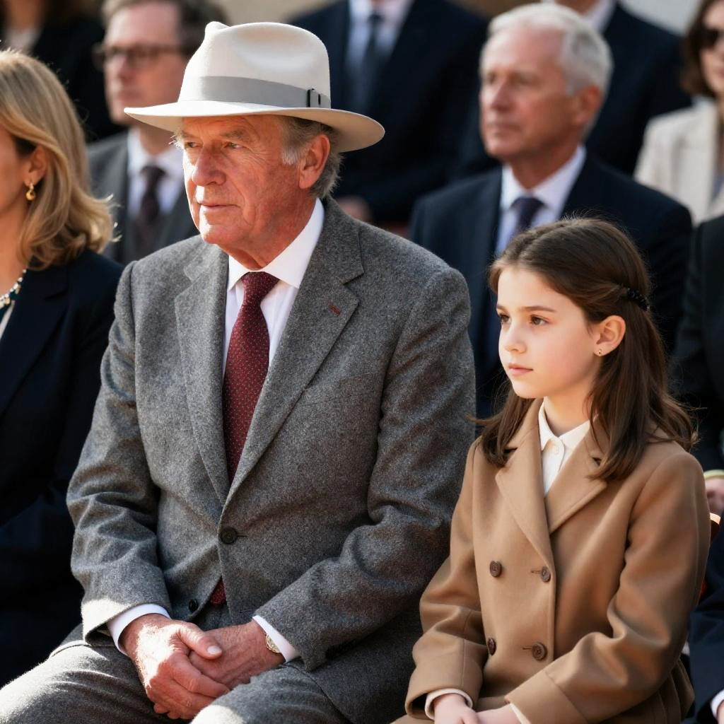 Photograph of a crowded audience. Front row: woman in purple dress and wide-brimmed hat, young blonde girl in green dress, man in brown suit with microphone. Background: diverse crowd, men in suits, women in formal attire.