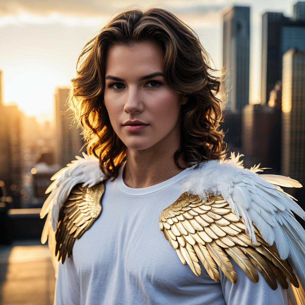 Photorealistic portrait of a young man wearing a white long-sleeve shirt adorned with gold wing-like patterns and large white feathered wings. The subject has shoulder-length wavy brown hair, blue eyes, and a serious expression. The golden light from the sunset illuminates the scene with a blurred urban cityscape in the background. The image features soft shadows and detailed textures, creating an ethereal, fantasy atmosphere.