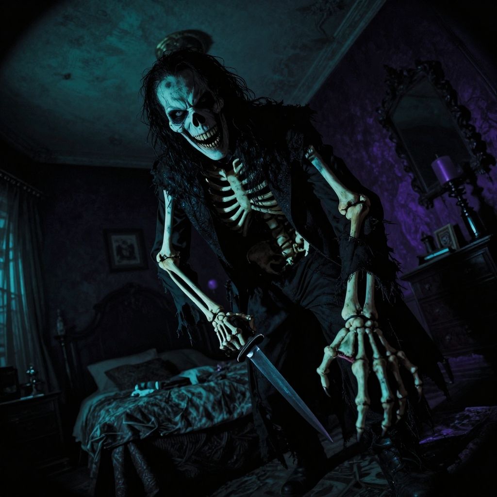 Cinematic dark photo of (terrifying skeleton with two arms and two legs), blackmagick sorcerer, evil grin, creeping leaning over the camera, in a bedroom, at night, hints of dark purple, vagabond ((tattered suit)), perfect hands holding a daggar, nefarious greenish-blue lighting, (low key lighting:1.2), (shadows:1.6), dutch angle, lit from below, low wide angle fisheye camera lens, action scene, foreshortening, chiaroscuro, (low-key:1.2)