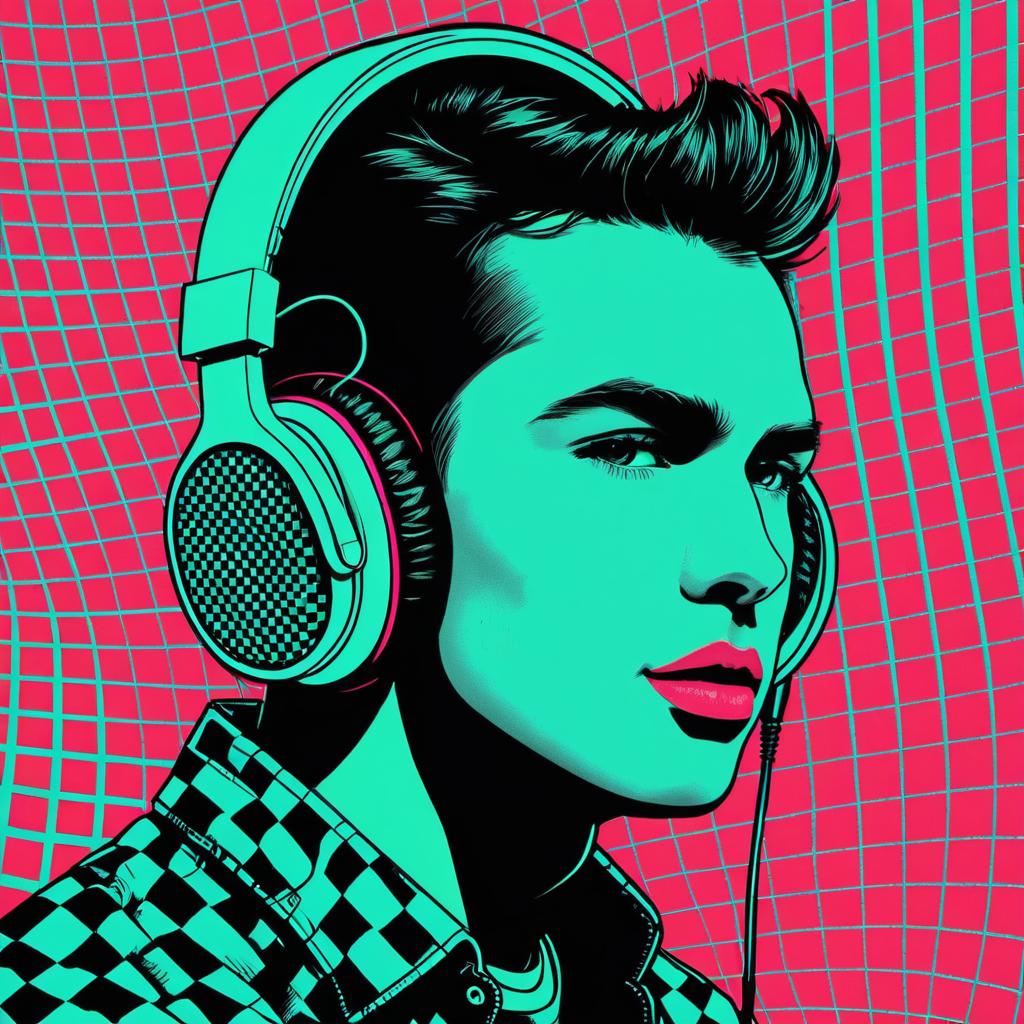 Pop art style digital illustration of a young man wearing oversized headphones. The image features bold red lips, flat vibrant cyan, lime green, and hot pink colors, and a checkered pattern on his shirt. The background consists of a dynamic grid pattern in hot pink. The face and features are rendered in a silhouette-style with high contrast, minimalistic line art, and no gradients or shading, reflecting a modern, expressive aesthetic.