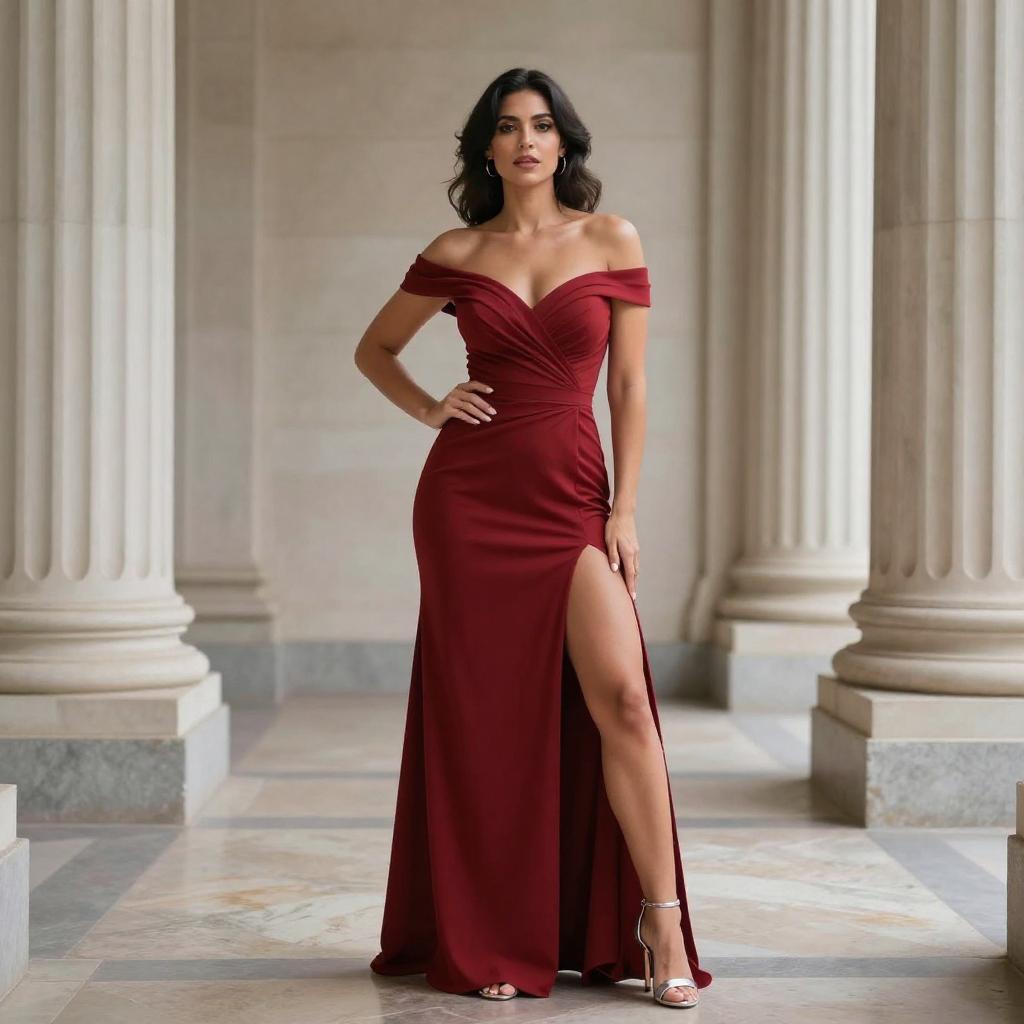 Photograph of a woman with long, dark brown hair, wearing a vibrant red, off-shoulder, form-fitting dress. She stands in a classical, arched hallway with marble columns and patterned tile floor, looking over her shoulder with a subtle smile. The lighting highlights her smooth, tan skin and the dress's ure.