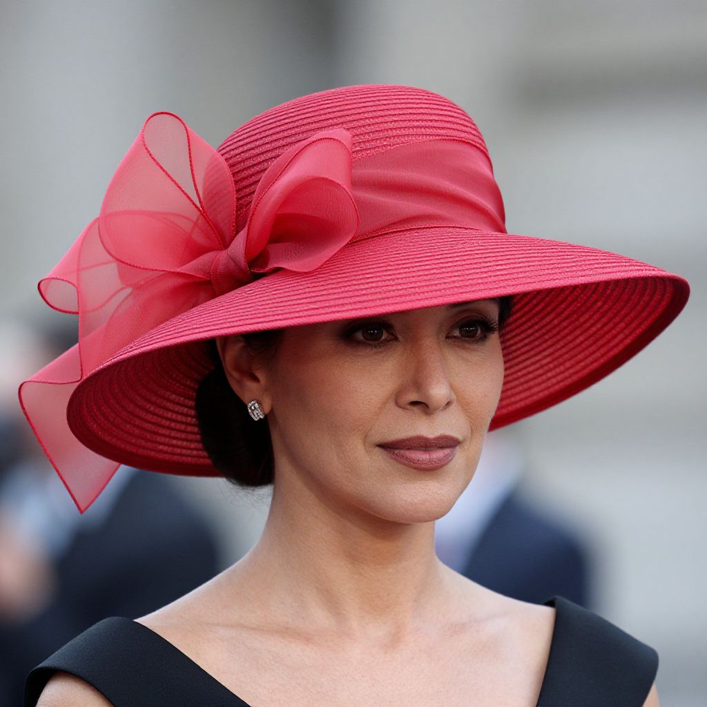Woman wearing a striking red wide-brimmed hat adorned with sheer fabric ribbons and a bow, exuding elegance and sophistication for a special occasion.