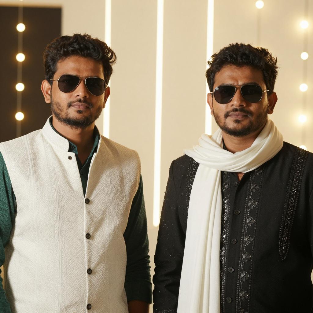 Two men standing side by side, backlit by warm, glowing lights. Man on left wears green shirt, white vest with intricate patterns, and sunglasses. Man on right wears black jacket with silver embellishments, white scarf, and sunglasses. Both have serious expressions. Background includes vertical light strings.
