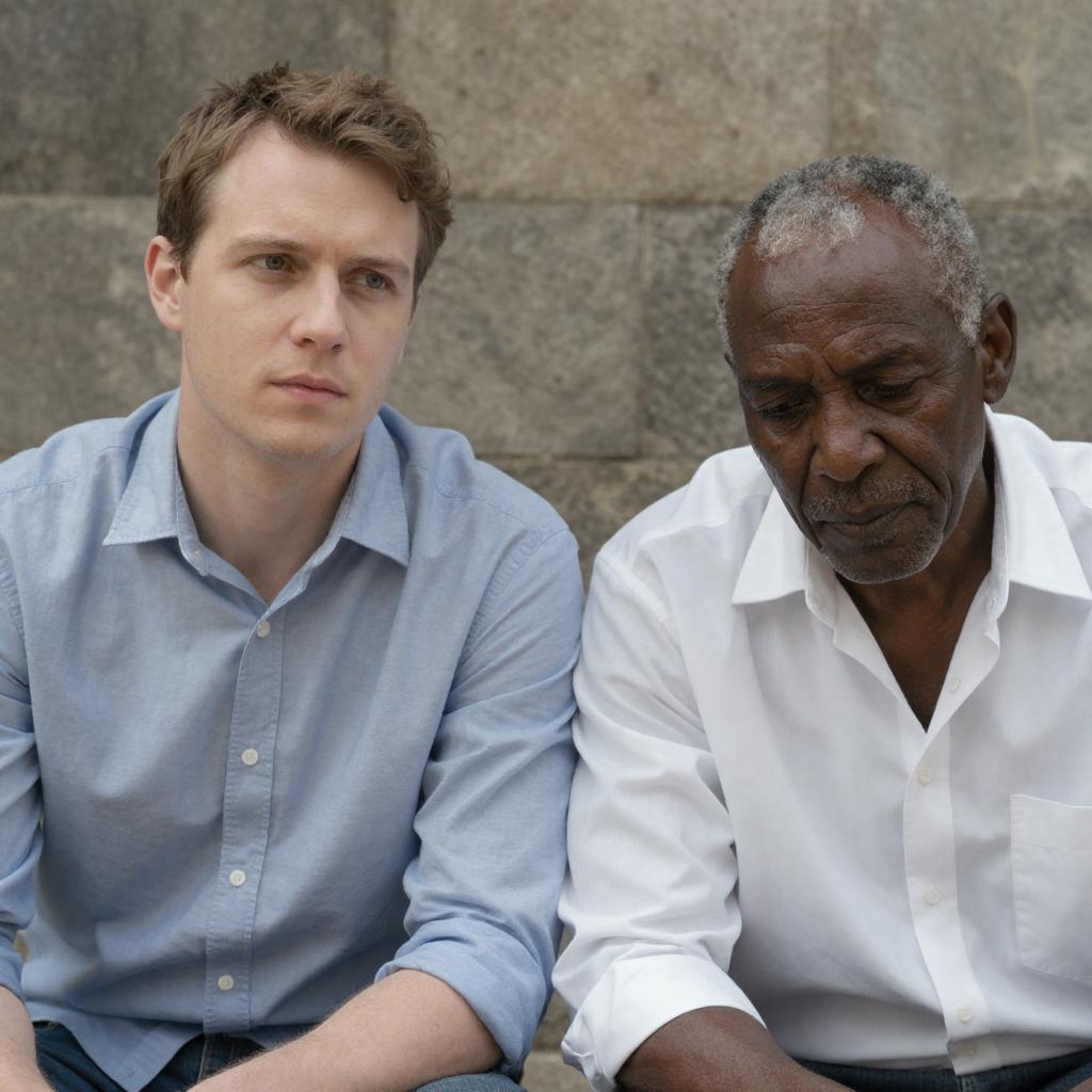 Photograph of two men sitting on a stone wall. The white man with slicked-back brown hair holds a cup, looking serious. The black man with gray hair wears suspenders, looking contemplative. Both wear light blue shirts and blue jeans.