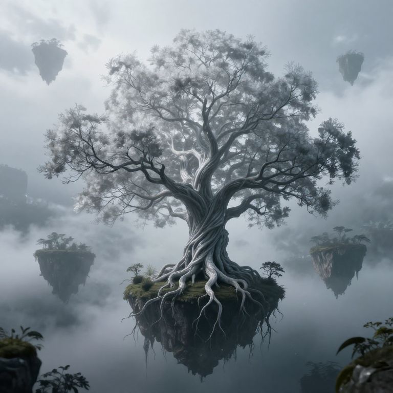 Digital artwork of a towering, ethereal tree with sprawling roots, floating on a misty, fog-covered island, surrounded by floating rock formations.