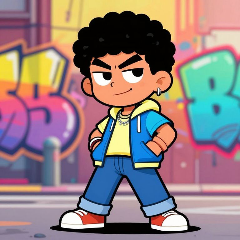 Cartoon character with short curly hair, wearing trendy casual clothes, urban street background with graffiti art, energetic and confident stance, bright and bold colors, exaggerated features, modern comic style