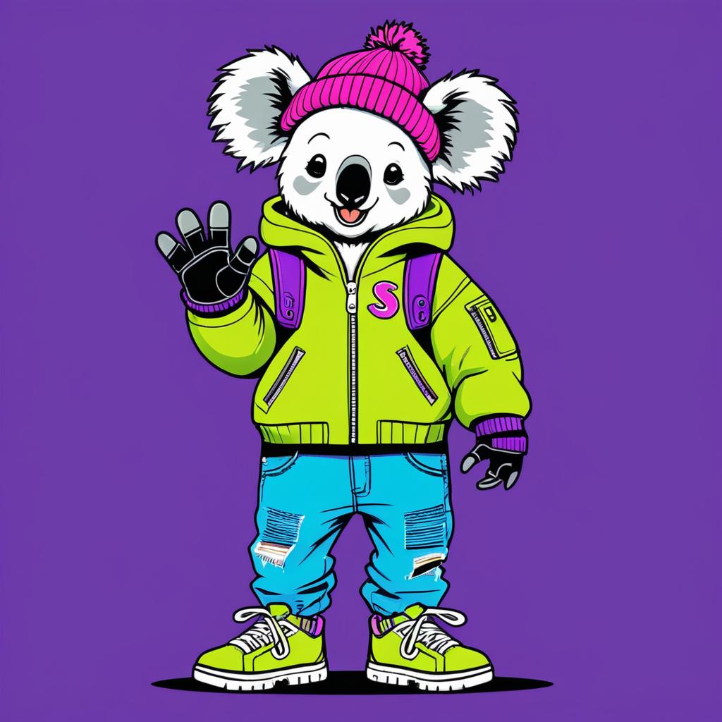 Vibrant cartoon-style illustration of a koala character wearing a neon green puff jacket with a purple 'S' patch, ripped blue jeans, yellow-green sneakers, black fingerless gloves, purple backpack, and a bright pink beanie. The koala is standing against a solid purple background, waving with a playful and confident expression. The artwork features bold outlines and bright contrasting colors, embodying a modern, slightly retro hip-hop style.