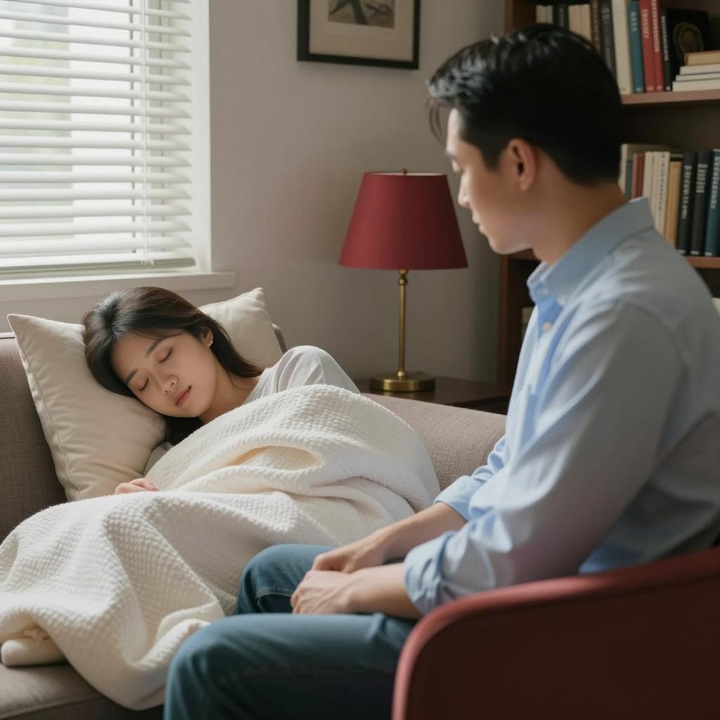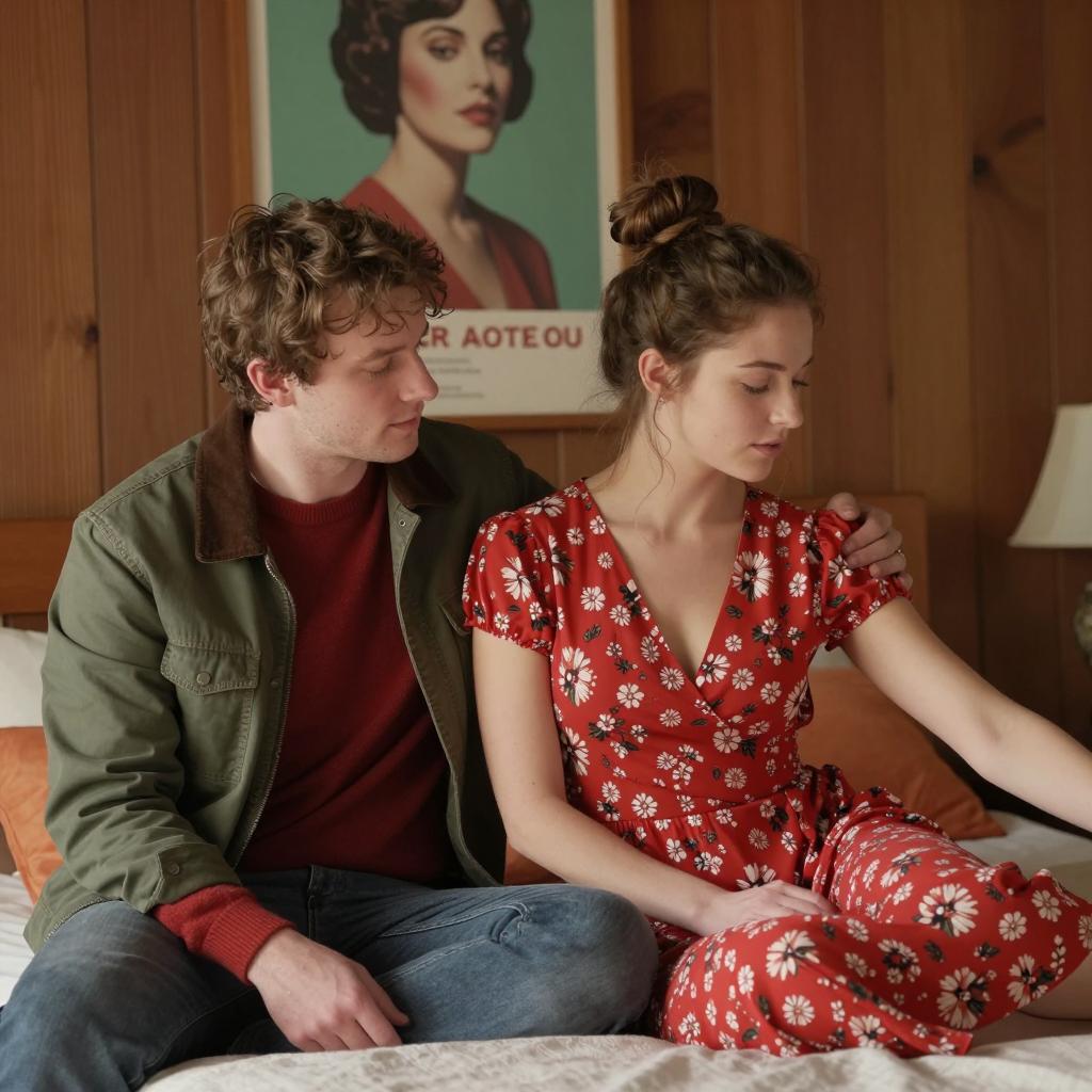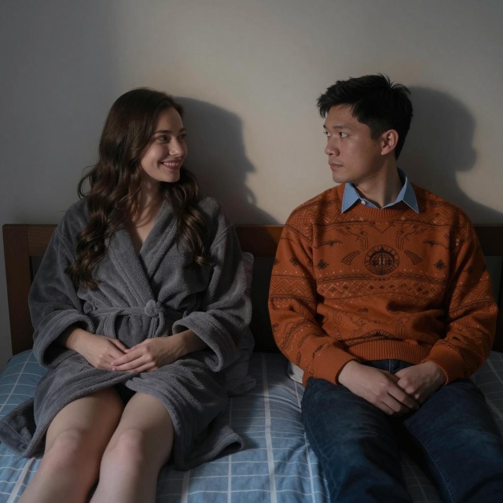Two people on a bed, dimly lit. Woman on left, wearing gray bathrobe, smiling, hands in lap. Man on right, orange patterned sweater, blue shirt, looking at woman, neutral expression. Shadows on wall. Bed with blue checkered blanket.
