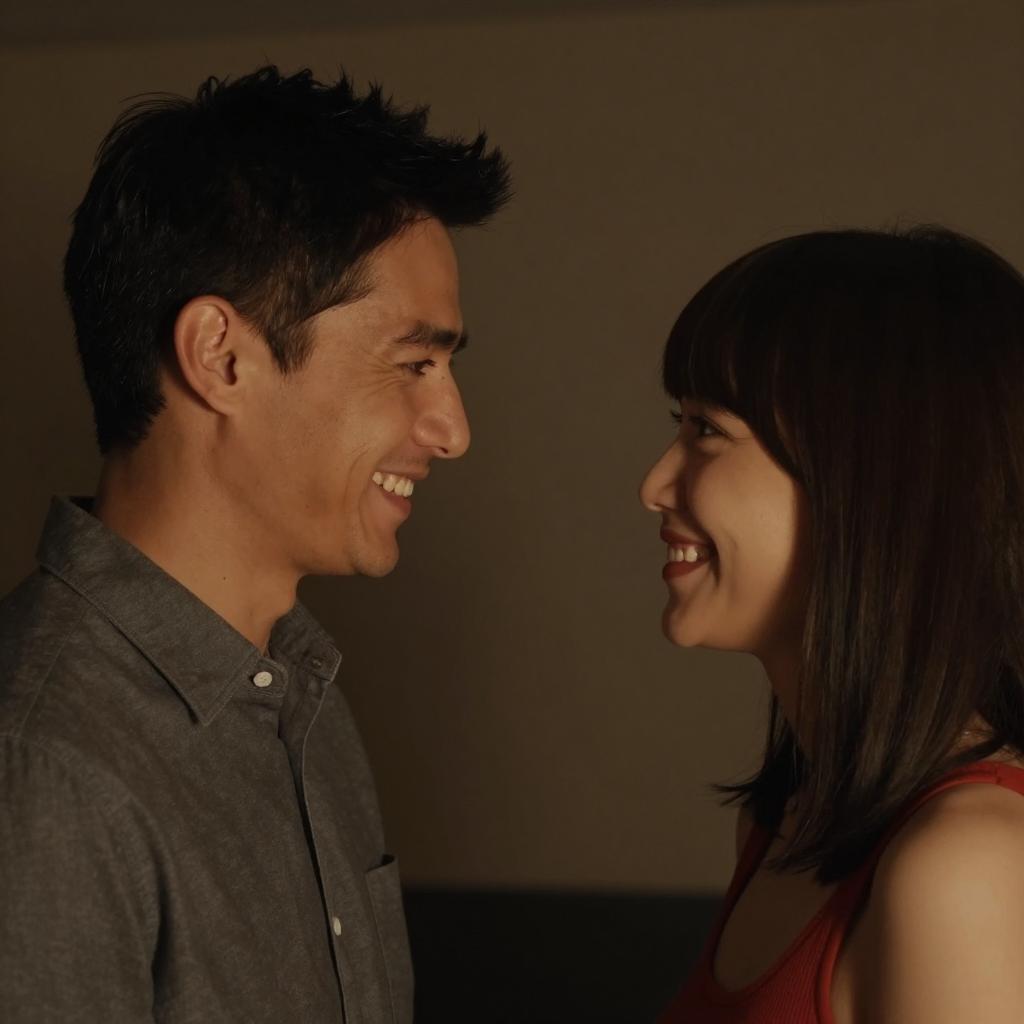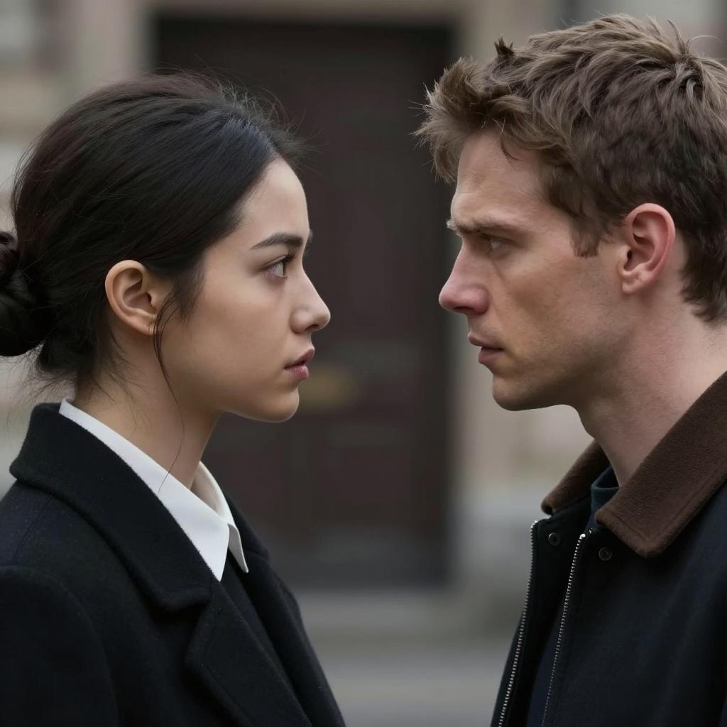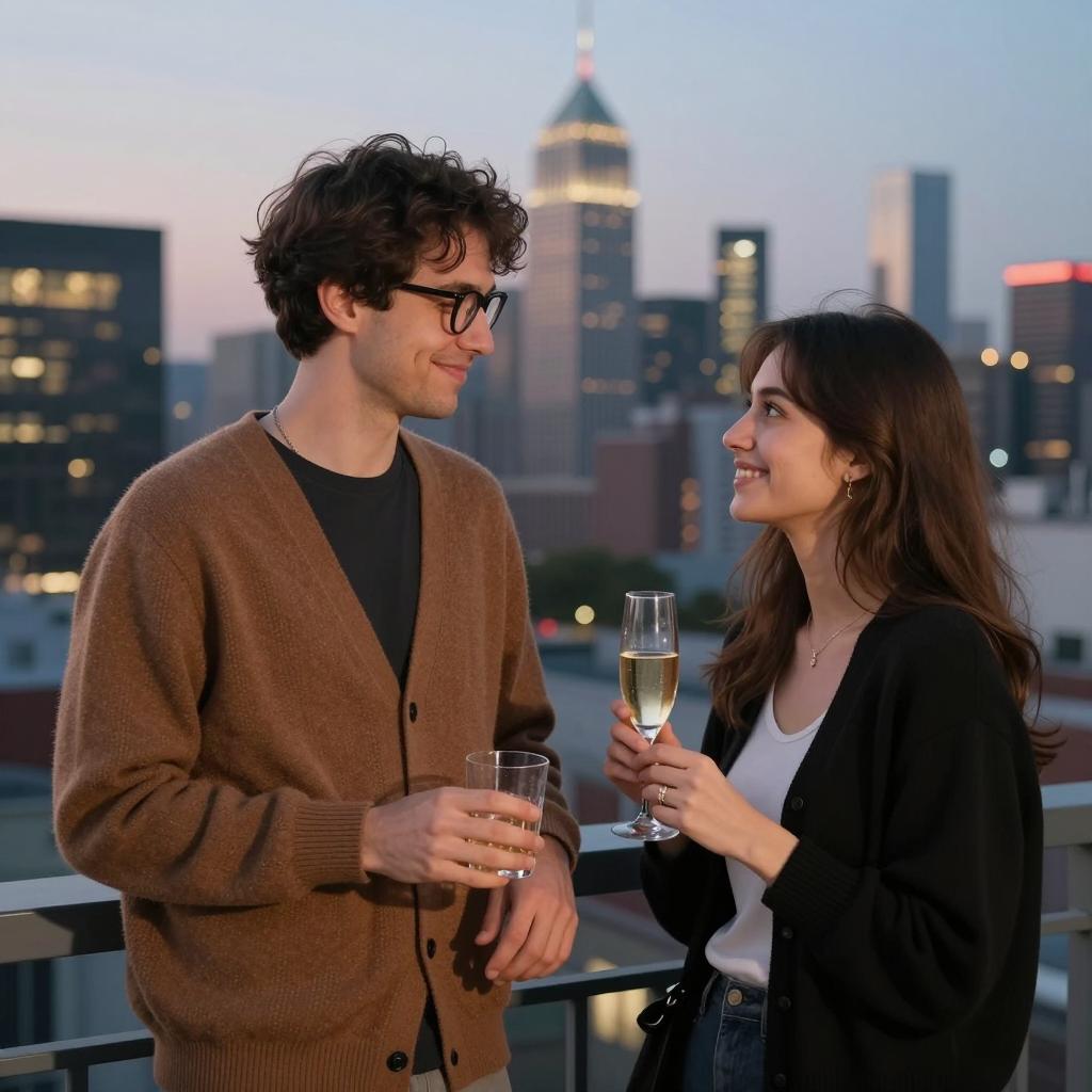 Two people on a bed, dimly lit. Woman on left, wearing gray bathrobe, smiling, hands in lap. Man on right, orange patterned sweater, blue shirt, looking at woman, neutral expression. Shadows on wall. Bed with blue checkered blanket.
