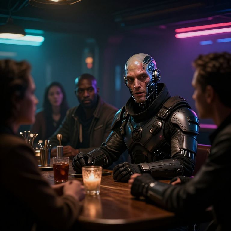 Photograph of a dimly lit bar with neon blue and pink lights. A central, bald man with a futuristic, metallic, black armored suit and glowing headset sits at a wooden bar counter. His expression is serious. Surrounding him, four other people, blurred in the background, wear dark clothes. Drinks, including a glass with ice and a brown liquid, are on the bar. The overall atmosphere is sci-fi themed, with the man's advanced armor contrasting against the casual bar setting. The image has a dramatic, cinematic style.