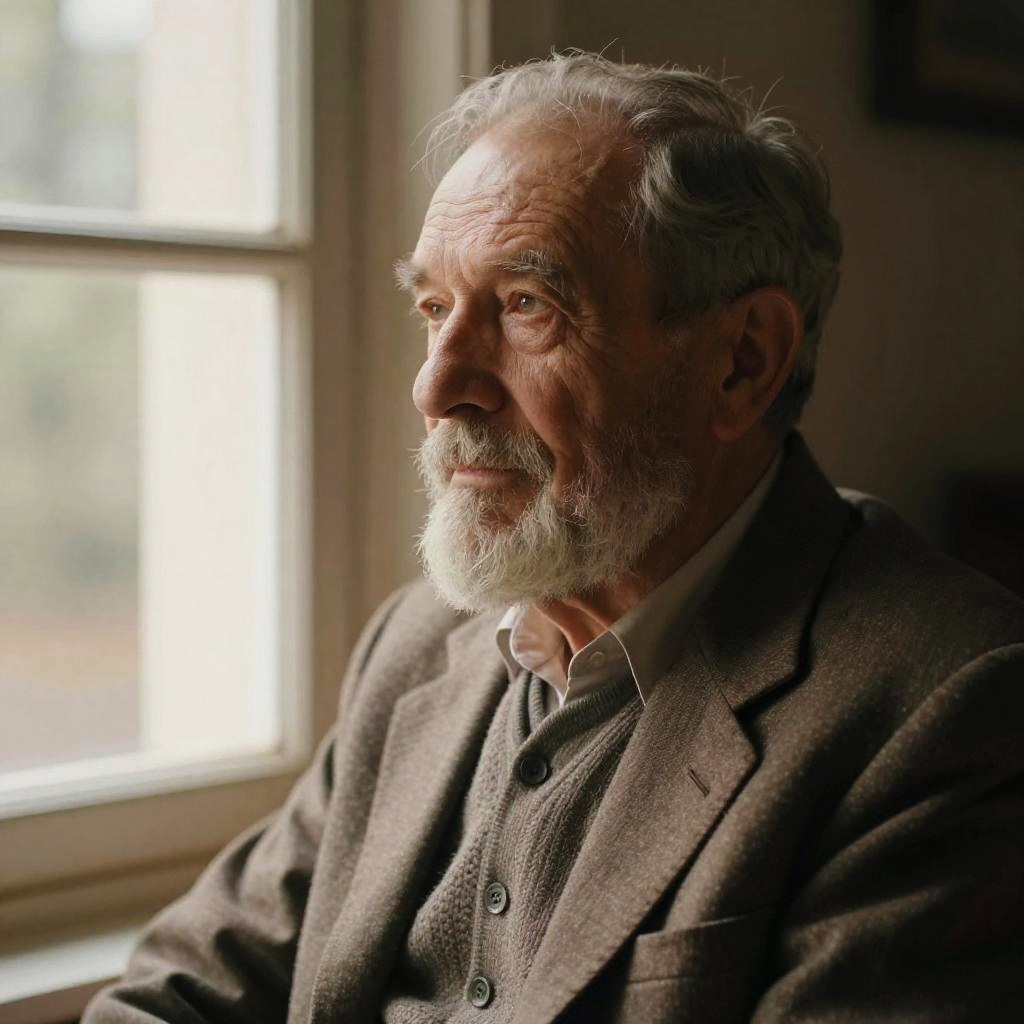 Photograph of an elderly Caucasian man with a weathered face, white hair, and a full white beard, seated indoors near a sunlit window. He wears a brown tweed blazer over a white collared shirt. The natural light from the window casts soft shadows on his face, highlighting his wrinkles and thoughtful expression. The background is slightly blurred, showing a simple, warm-toned interior. The man's attire and demeanor suggest a thoughtful, introspective character. The image has a warm, gentle color palette, focusing on the contrast between the man's face and the bright window light.