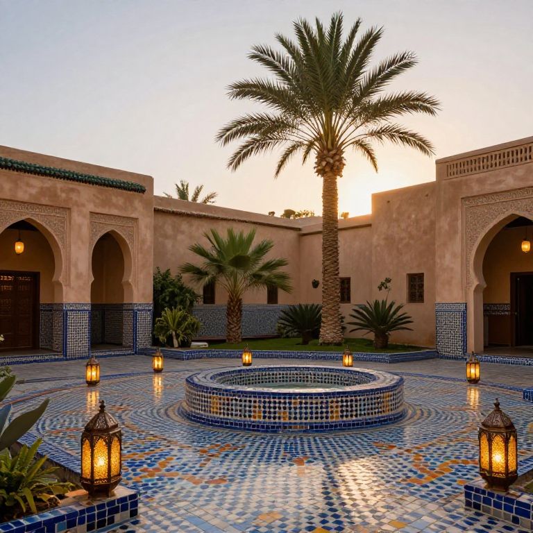 Arab prompt set in a modern Moroccan courtyard during dawn, colorful mosaic tiles, palm trees, traditional lanterns, warm golden light, detailed textures, serene atmosphere, rich cultural fusion of architecture and nature.