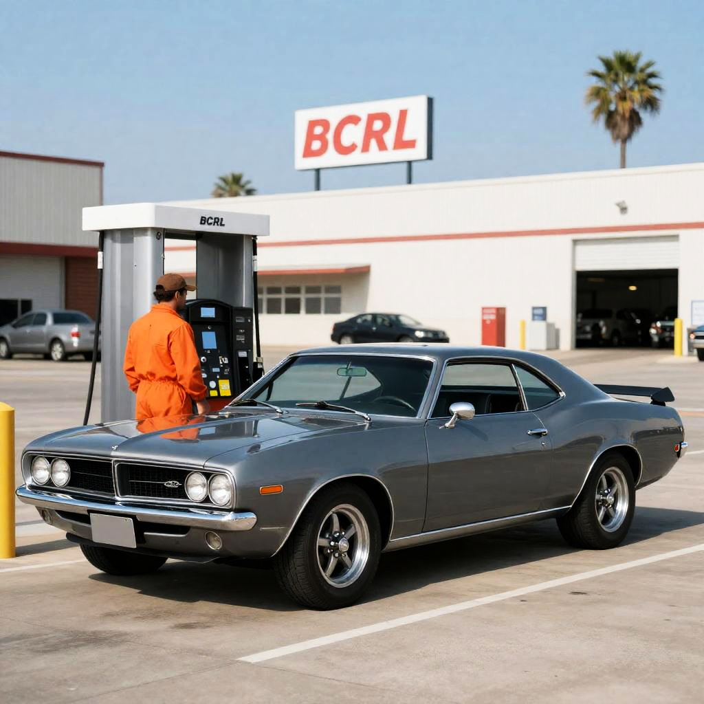 Photograph of a gray muscle car with chrome details, parked in an outdoor lot. A man in orange jumpsuit and brown hat stands near a gas pump, facing away. Background includes industrial buildings, a large sign, and a palm tree. Clear blue sky.