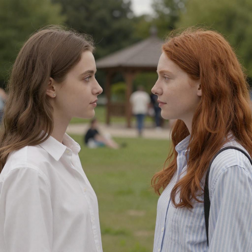 Photograph of two young women with intense expressions, facing each other in a close-up shot. The woman on the left has long brown hair, fair skin, and a serious look. The woman on the right has short, curly blonde hair, fair skin, and a focused expression. They are separated by a vertical wooden panel with a ured, worn surface. The background is blurred.