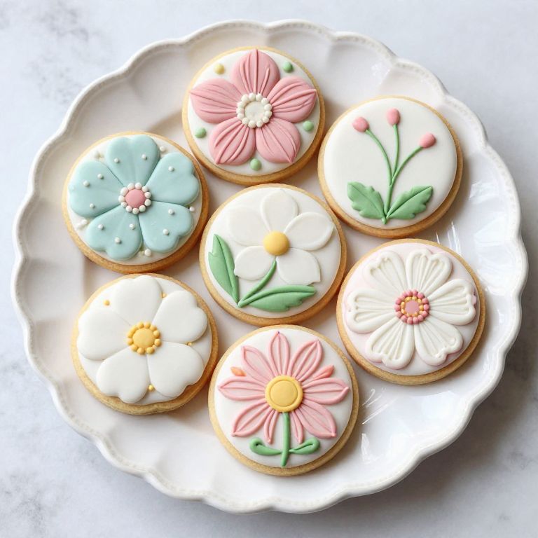 A delicate arrangement of Royal Icing Garden Cookies, featuring intricate floral designs and pastel accents, displayed on a scalloped white plate with a subtle vintage aesthetic, showcasing the artistry of handcrafted confectionery.