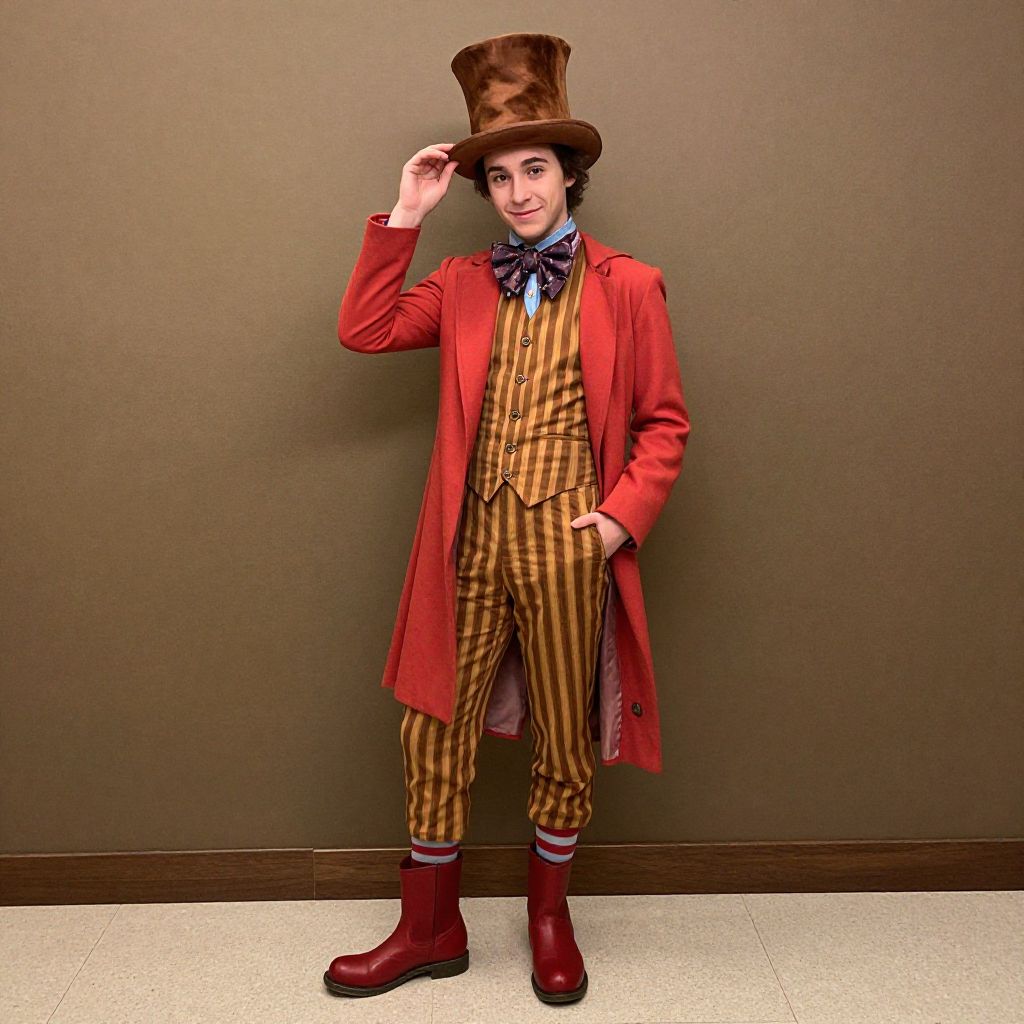 "wonka bar costume, solo, 1boy, male focus, hat, red footwear, striped socks, top hat, pants, full body, hand in pocket, standing, striped clothes, vest, socks, indoors, smile, looking at viewer, boots, bowtie, long sleeves, coat, brown hair Realistic photo of casual sexy person with pretty face"