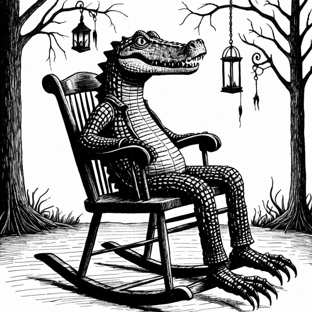 Drawing of an eerie crocodile perched on an old, creaky rocking chair, whimsical art style inspired by Tim Burton, Edward Gorey
