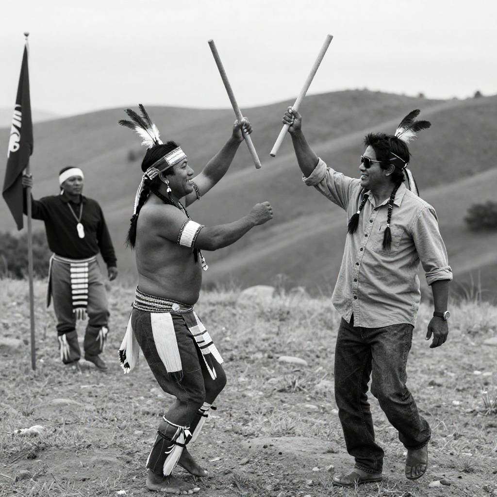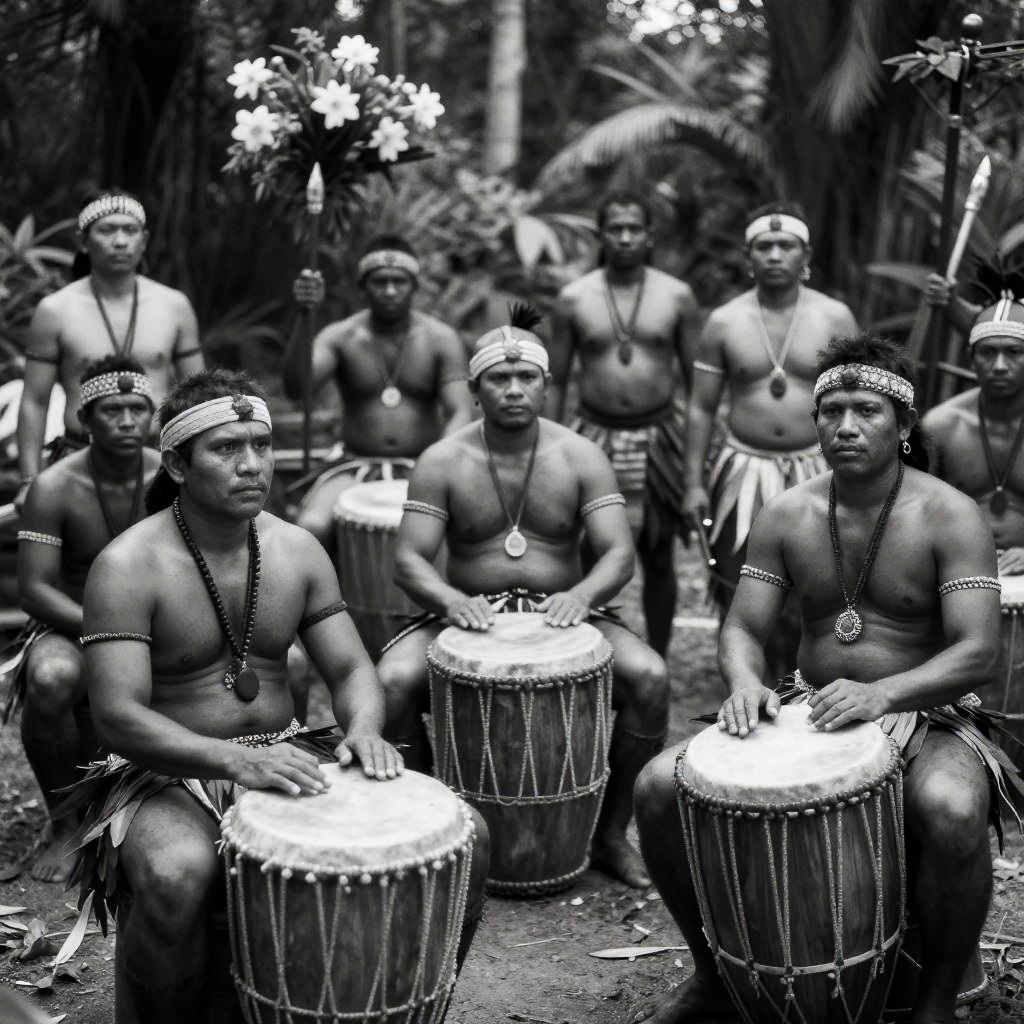 Black-and-white photograph of a group of muscular, shirtless men with tribal headbands and leaf skirts, seated and standing around large drums, surrounded by foliage and flowers. Some men hold weapons. Intense expressions visible. Several men in the foreground, more in the background. Dense, natural setting.